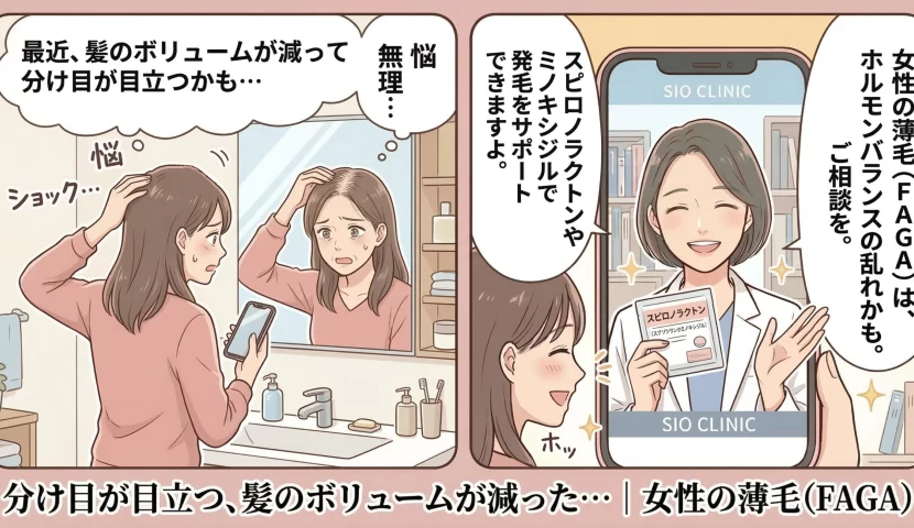 • 抜け毛を「止める」: スピロノラクトンで薄毛の原因となる男性ホルモンを抑えます。