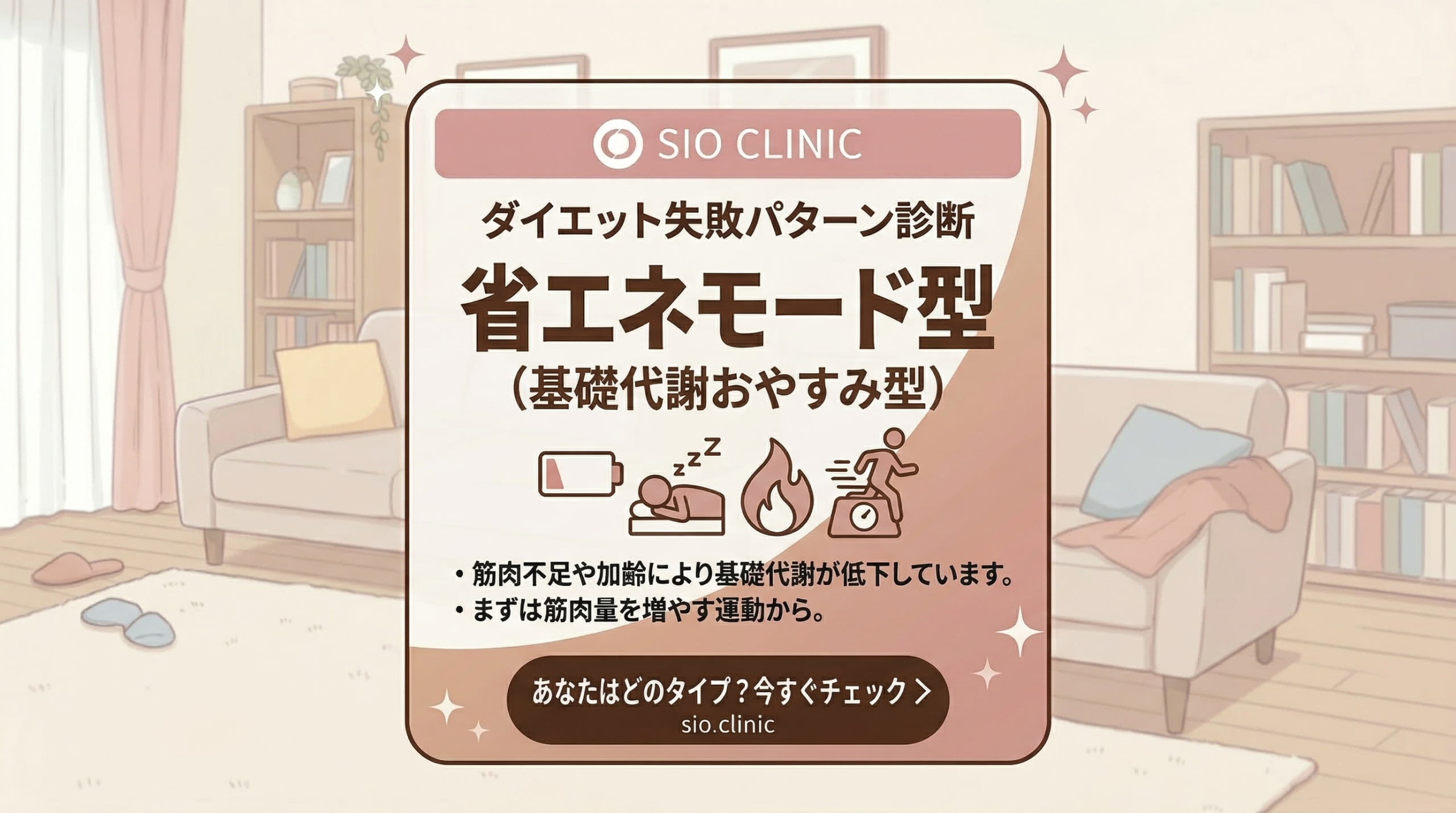 - 2. 加齢や無理な制限による「基礎代謝の低下」:筋肉量が減り、体が「飢餓状態だ」と勘違いして省エネモードになります。